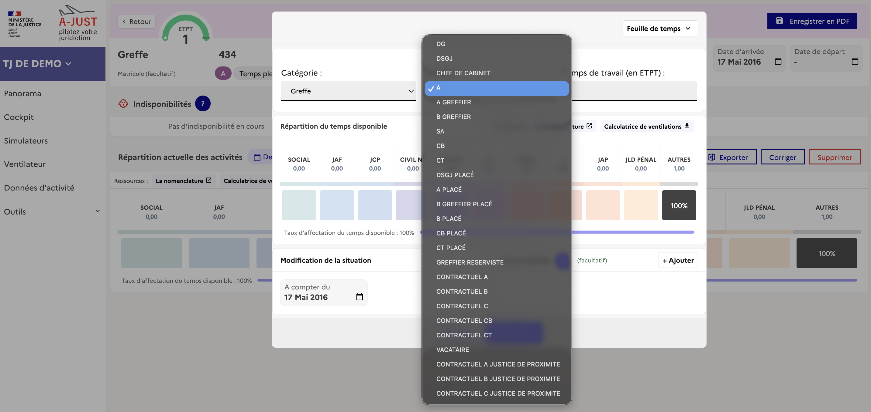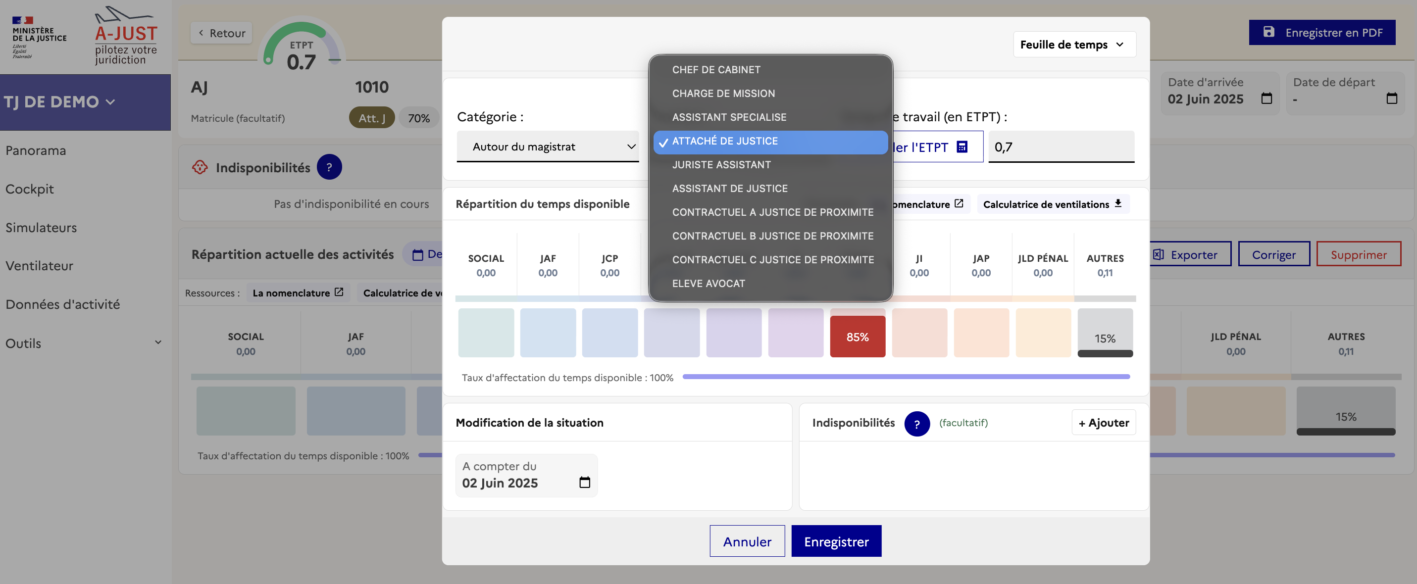* **Pour enregistrer une nouvelle situation ou répartition du temps de travail,** étape nécessaire à l'historisation des différentes affectations de l'agent et à la justesse des calculs d'ETPT en cas de changement dans la situation ou les affectations de l'agent, vous pouvez vous référer à la section « [Enregistrer une nouvelle situation](https://docs.a-just.beta.gouv.fr/guide-dutilisateur-a-just/ventilateur/creer-ou-modifier-une-fiche/enregistrer-une-nouvelle-situation) »