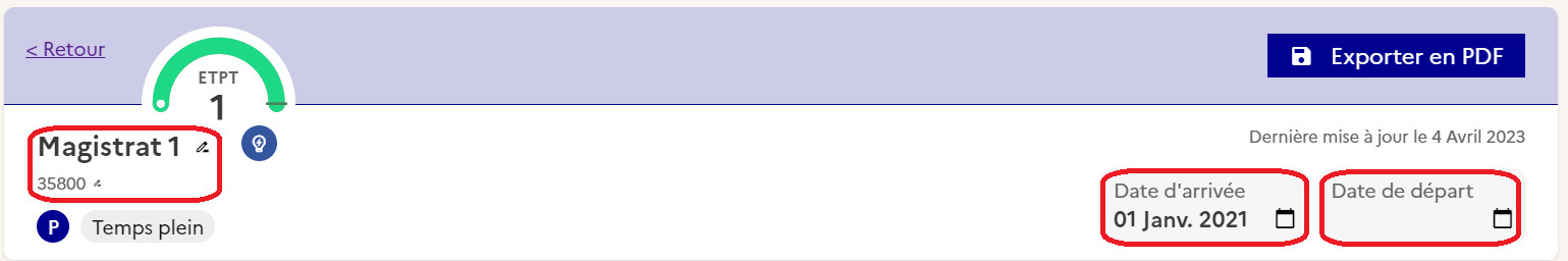 Vous pourrez modifier les **nom, prénom, matricule et date d'arrivée ou de départ** de la juridiction en saisissant les nouvelles valeurs directement dans les champs concernés.