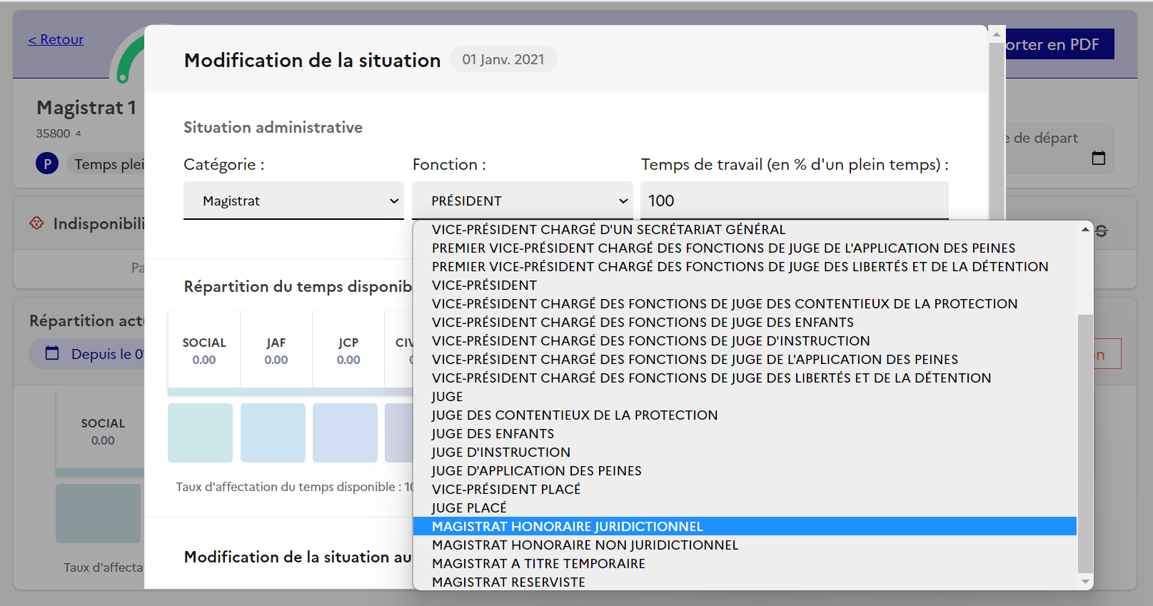 <figure><img src="https://610843379-files.gitbook.io/~/files/v0/b/gitbook-x-prod.appspot.com/o/spaces%2FrovbWldtaIoFahBgPnfk%2Fuploads%2FlznxnHS2PQIFXSb6uL71%2FListe%20des%20fonctions%20pour%20magistrats.png?alt=media&#x26;token=c00ed559-a3a9-4529-a769-b65897c20a39" alt=""><figcaption><p>Liste des fonctions de magistrats</p></figcaption></figure>