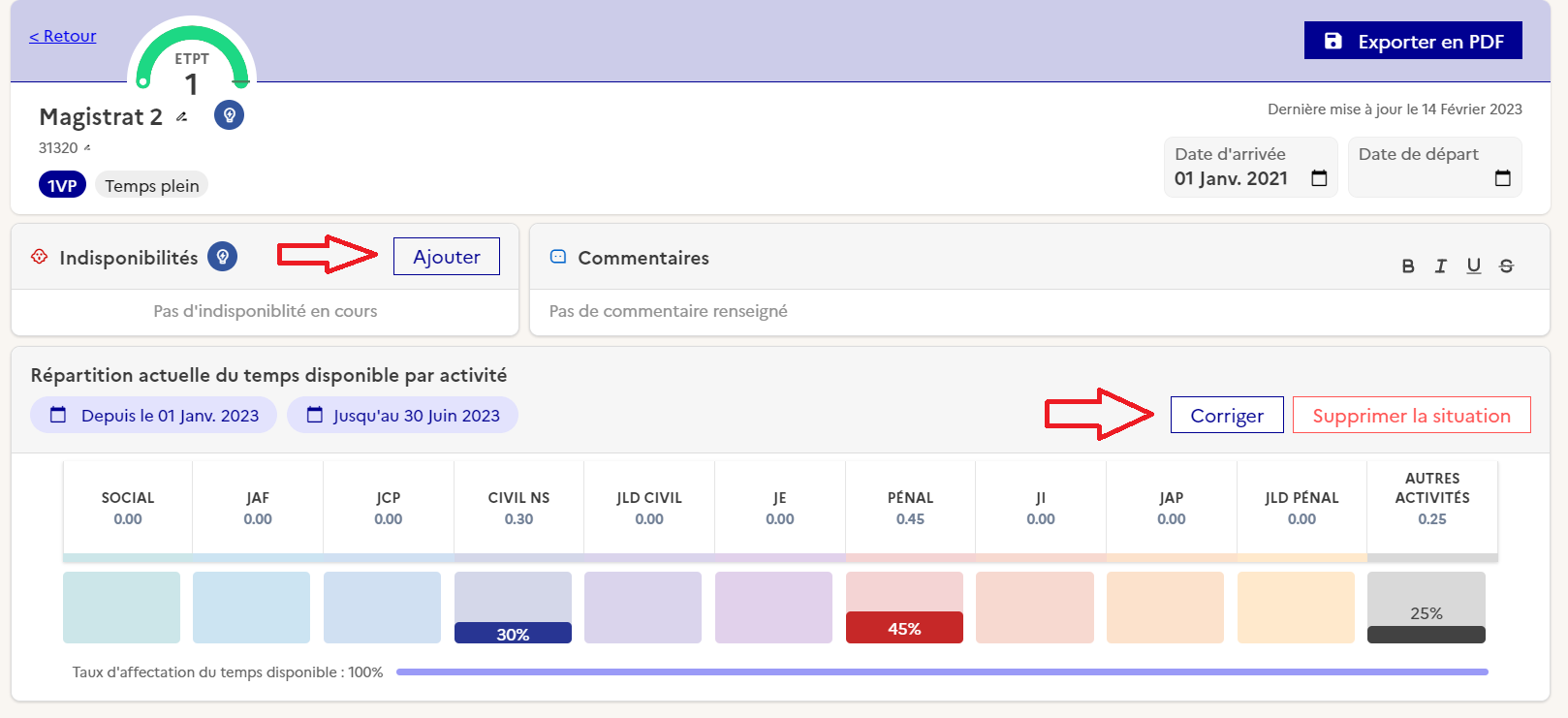:mag: Cliquez sur ***« Corriger cette situation »*** ou ***« Ajouter une indisponibilité »*** (cf : [Renseigner les indisponibilités](https://docs.a-just.beta.gouv.fr/guide-dutilisateur-a-just/ventilateur/renseigner-les-indisponibilites)) selon l'action désirée